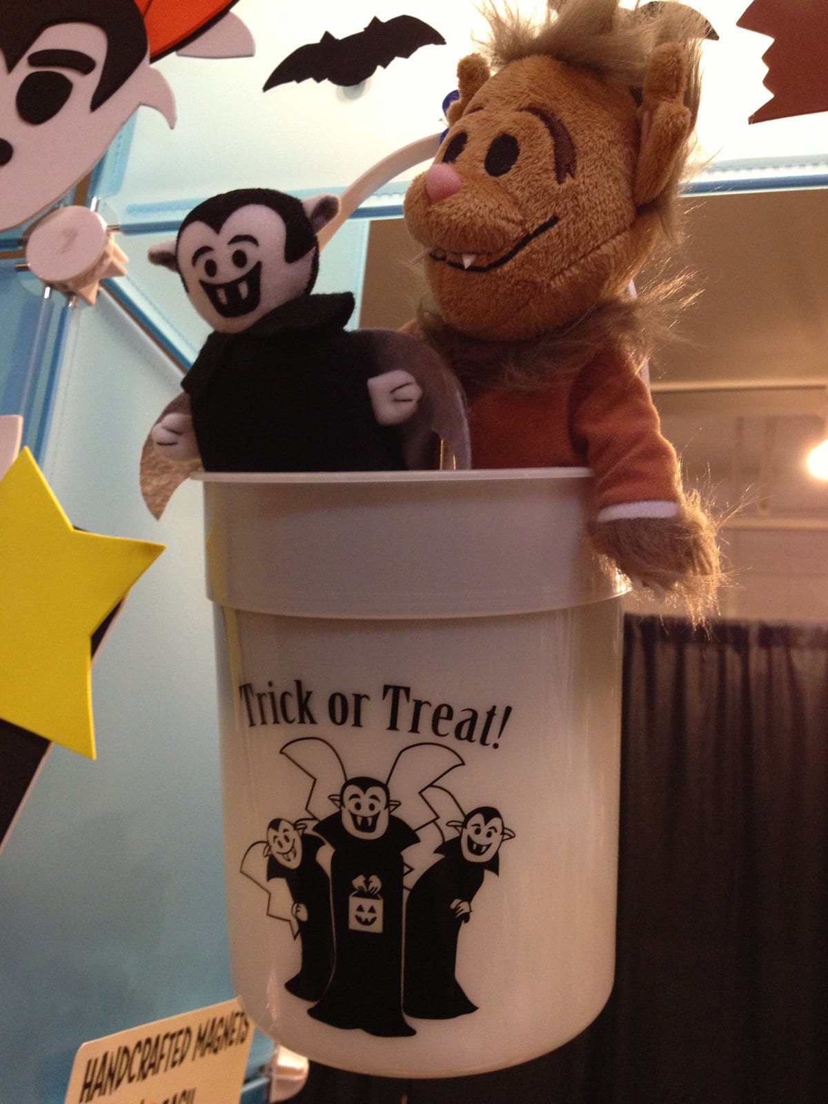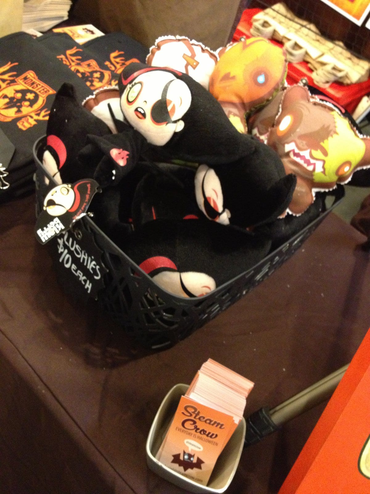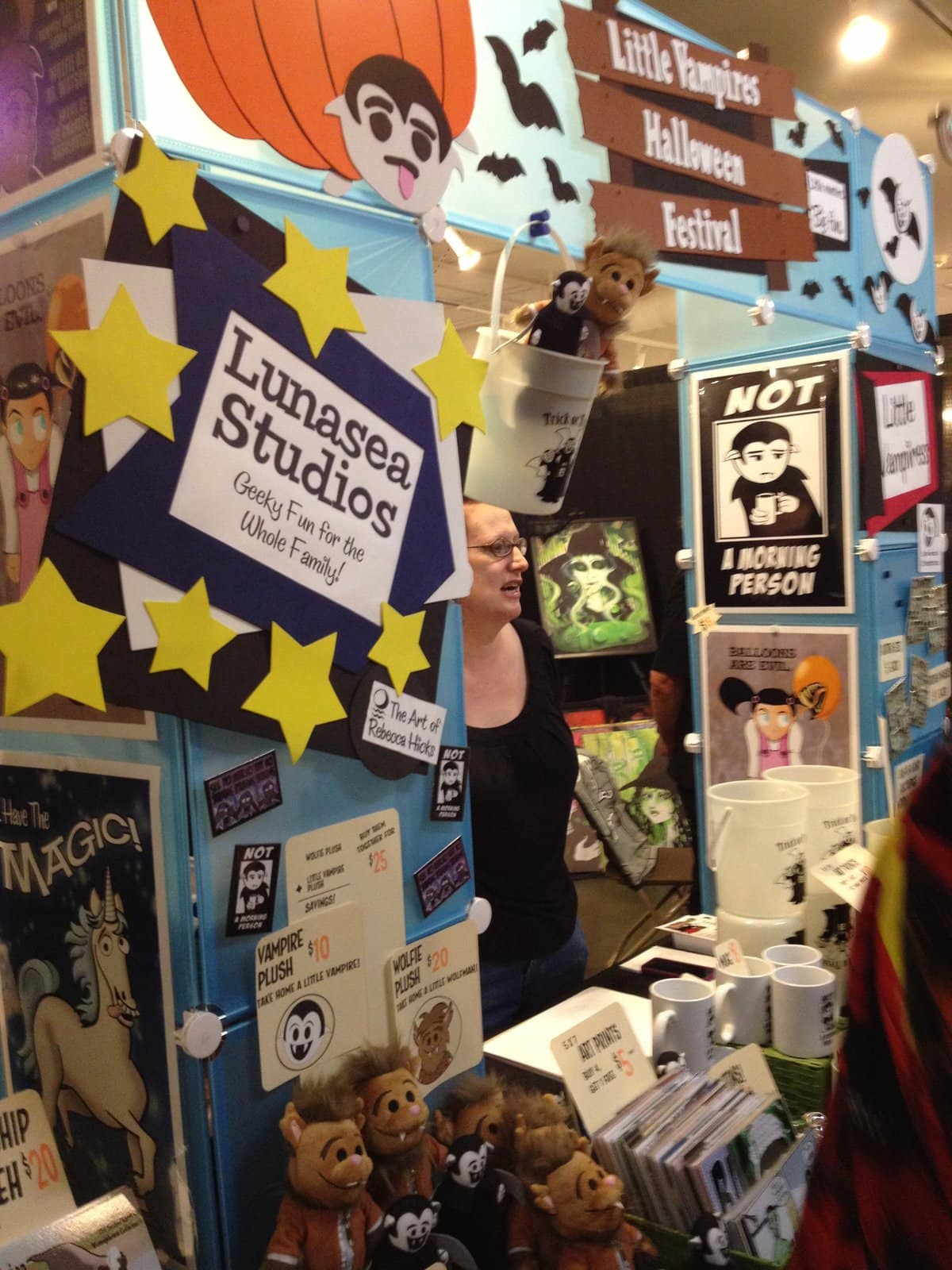 When I arrived at LAMart, I was happily directed by staff members in skeleton print T-shirts on where to go. I got my paper wrist band for the day and was directed to the elevators. The doors opened on the second floor and I stepped out into a Halloween wonderland. The walls were covered with decorations, T.V. monitors played haunting videos, and lighted pumpkins lined a wall. Sadly that is where the Halloween decorating ended and the booths started. But it was successful in getting me into the Halloween mood, I hope next year that they continue to add little bits of decorations on the pillars or banners throughout the convention floor. Maybe even let the booth owners decorate their spaces, have a silly contest and give the winners free coffee or lunch (cause I would love free lunch as a booth owner and working a long day selling my stuff).