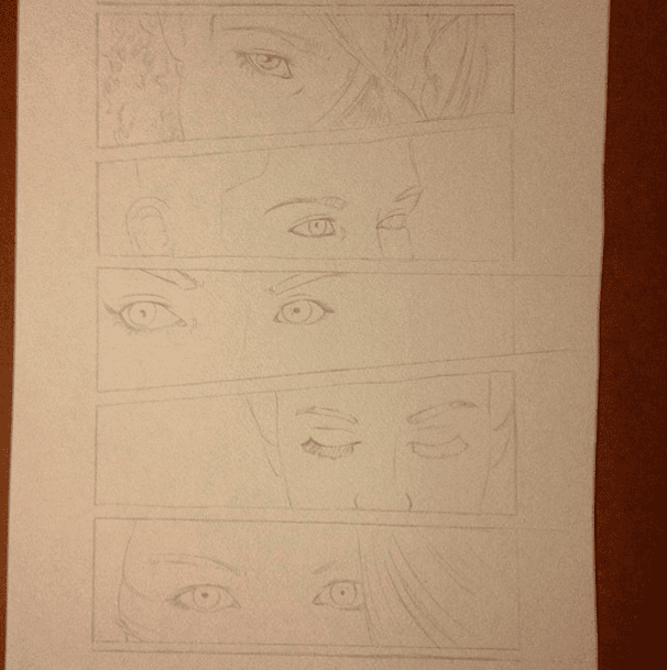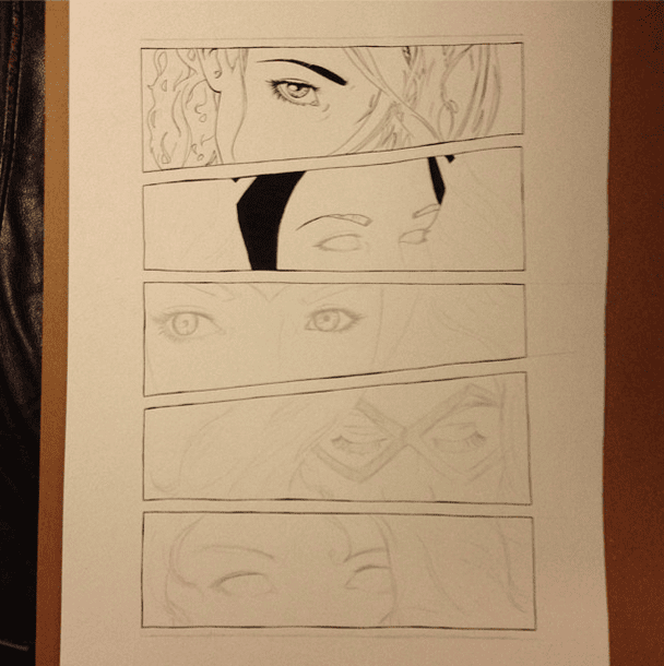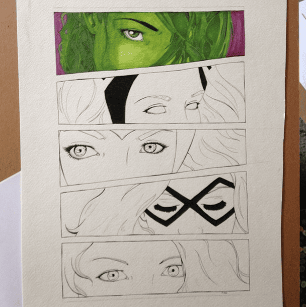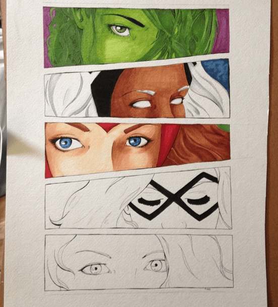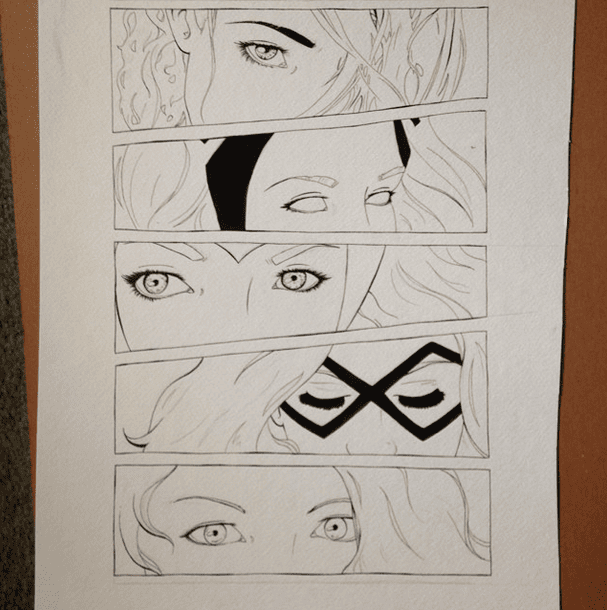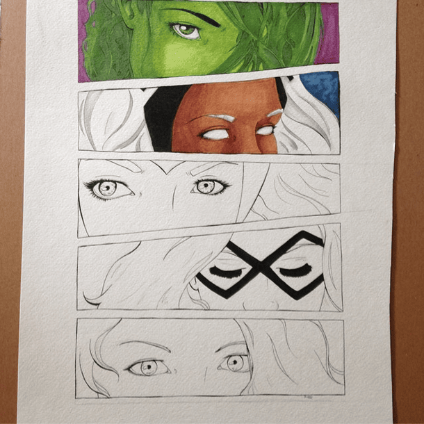 For this piece of artwork, I was inspired to try drawing only the eyes of my 5 favorite Marvel women; She-Hulk, Storm, Scarlet Witch, Ms. Marvel, and Jean Grey. The order is not from my favorite to least favorite but more what I felt would look nice and help the eye move across the page.